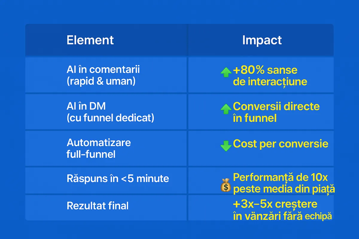 GPT răspunde la comentarii, iar agenții AI contactează automat utilizatorii interesați direct în DM, în funcție de sentimentul detectat.
