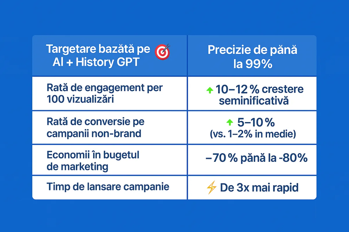 👉 Rezultat: conversii de 5–10% chiar și pe branduri noi și economii de până la 50% din bugetul de marketing.